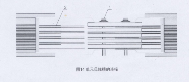 先取出序號1連接螺栓,然后將序號2母線槽插入,再穿上序號1連接螺栓,墊入碟形墊圈,用扭力板手將螺母擰緊(扭趴不小于6ONm),然后裝上蓋板(見圖),擰緊接頭螺栓足母線槽連接的保證。緊固后的接頭檢查要求用0.1mm的塞尺不能插進(jìn)。