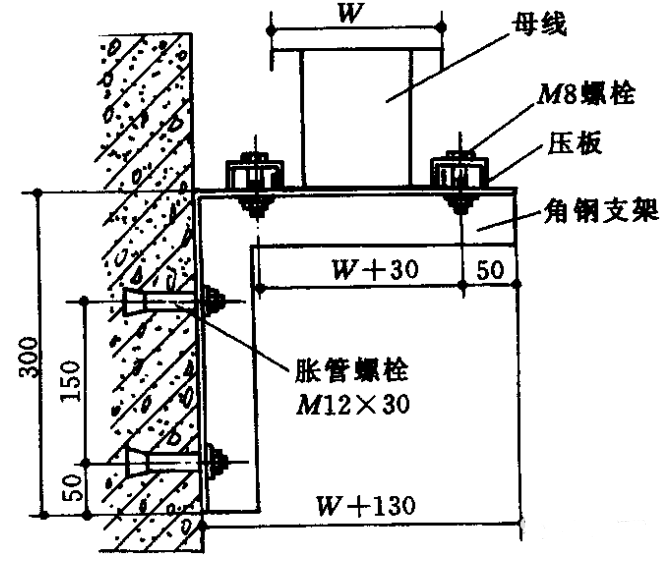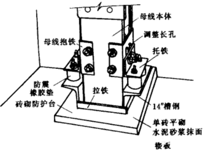 4.5封閉式母線垂直安裝。沿墻或柱子處,應做固定支架,過樓板處應加裝防震裝置,并做防水臺(圖7)。