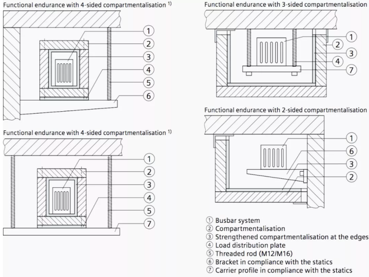 對于母線槽系統,可根據設計和類型與母線槽系統一起訂購符合DIN 4102-9防火等級S60,S90和S120的建筑物各個防火區域之間的防火墻 。防火墻必須至少具有與相關墻壁或天花板相同的耐火等級。