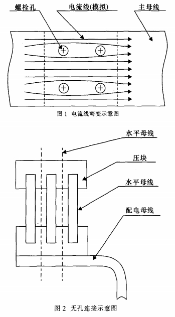 現在,低壓成套開關設備母線槽系統的聯接主要是運用螺栓聯接。螺栓聯接在小電流、母線槽數量不多的狀況下具有緊湊、可靠、便利等特色;而跟著用電設備的添加,開關柜的容量越來越大,用螺栓聯接的缺點也日益顯露出來:因為需要在母線槽上鉆螺栓孔,形成母線槽截面不同,必然引起母線槽電流流線的畸變,如圖1所示。所以要求螺栓用孔盡可能的小以盡量減小對電流的影響,但是在配電房里進行拼柜的過程中不可避免的存在累積公役,開關柜的數量越多累積公役越大,往往形成配電母線槽和主母線槽的螺栓孔發生錯位。為了處理螺栓孔錯位問題,大都狀況下是選用沖橢圓形孔或沖大孔。這就存在矛盾:螺栓孔開大了,嚴重影響母排載流量,螺栓孔開小了,設備不便利。研討新的聯接方法成了開關柜制造商的注重的焦點,無孔聯接這種新技術逐漸成為規劃人員研討的政策,并且取得必定的成功。現在已有多家廠家研討出方法各異的的無孔聯接技術。筆者也于2001年初步對無孔聯接技術進行研討,并規劃出另一種與眾不同的無孔聯接方法,通過產品試制和實驗,證明這種聯接方法是卓有成效的。