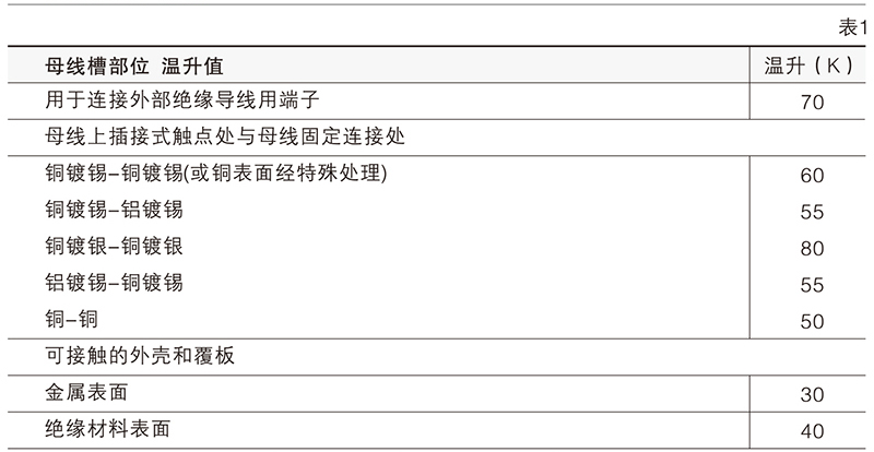 母線槽各部位溫升不應(yīng)超出表1規(guī)定,特殊情況下在不影響絕緣材料的絕緣性能和使用壽命時,可適當(dāng)提高溫升。