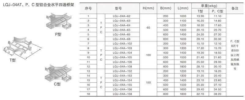 鋁合金電纜橋架在某種結(jié)構(gòu)形式中無(wú)其它結(jié)構(gòu)形式中的某-種產(chǎn)品類(lèi)別,選型可作代用表示。例如:在LQU-CC型槽式鋁合金電纜橋架結(jié)構(gòu)形式中,無(wú)鋁合金配線橋架中的LPC-03D, 即表示為LFC-CC-03D。